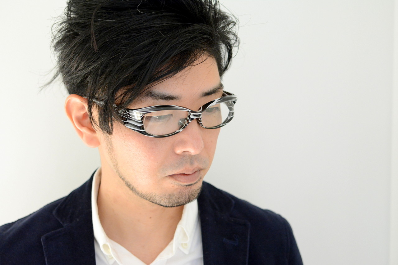 この撮影時にはワタクシ、紺のジャケットを着ていますが、このようにスーツスタイルに合わせて頂くことも出来ます。同じカテゴリーの「FA-310」より柔らかいレンズシェイプをもつこの「FA-312」は正面からは優しい表情を作りだし、サイドからは流れるようなスマートな印象を演出出来ます。