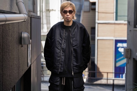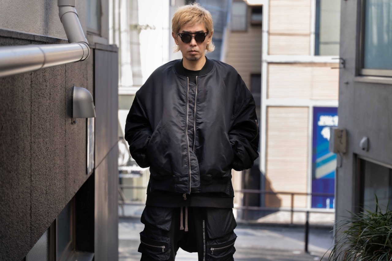 この日のアウターはこの数年の定番ともいえるMA-1ですが、例年よりもオーバーサイズでよりストリート寄りのデザインでボリュームを出し、「Who」のインパクトとバランスが取れるように意識しました。フードには赤柄を用いているため、これを差し色として考え、トップスも他の色は用いずシンプルな黒をチョイスしています。