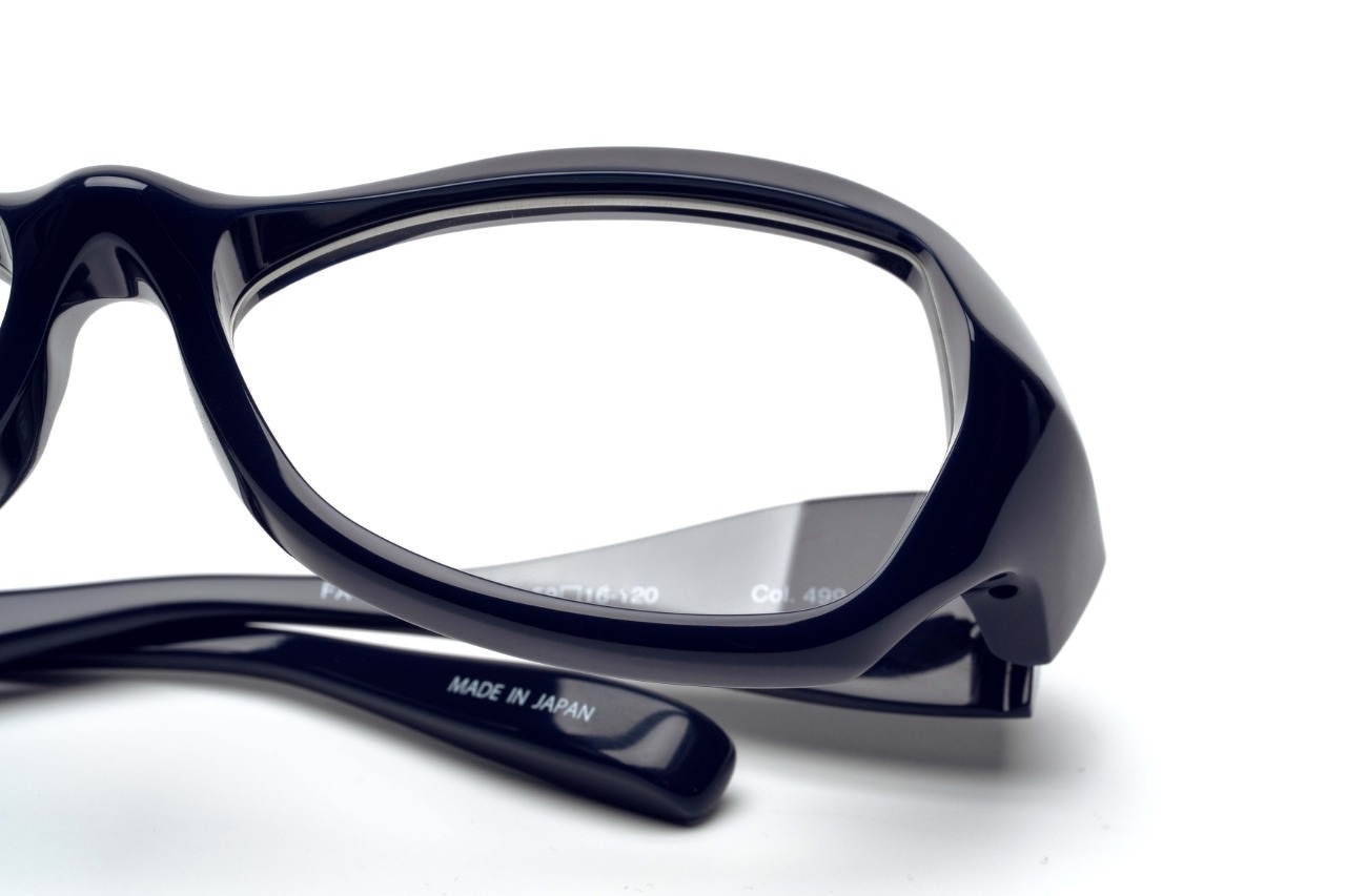 今回スタイルサンプルを撮影してみてまず感じたのは、サングラス仕様に比べフレームカラーのネイビーにしっかりと目が向けられるということです。もっと簡単にいえばネイビーの色合いがより認識しやすくなったといった方が正解かもしれませんね。まぁ当然といえば当然ですが、85%と濃度の濃いカラーレンズに引っ張られてしまうことで、フレームとレンズに一体感が増すサングラスに対して、「FA-441」のディテール同様、フレーム本来の色合いが強調されるオプティカル仕様といったところでしょうか。