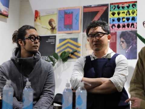 青山デザイナーとコラージュ作家の河崎ヒデオスさんを招いてのトークショーを開催しました。