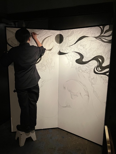 私がお邪魔したタイミングではちょうど屏風サイズのキャンパスにライブドローイングをされていました。