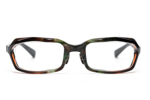 このように角度を変えてご覧いただくと、ブリッジの周辺に見えるグリーンから、智元に向かってオレンジに変化していくのがお分かりいただけます。また、テンプルは通常の”黒”になりますが、レーザーで刻印された”九百大阪”の文字がハッキリとご覧いただけます。