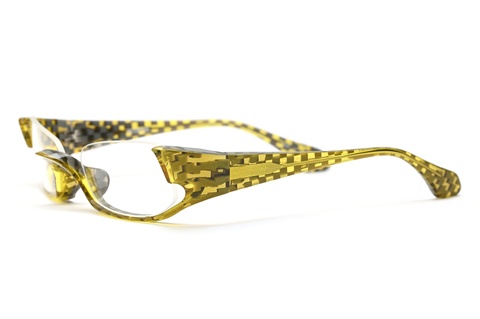 「FA-301」や「FA-241」のニューカラーバリエーションに使われたcol.377(紫/市松柄)同様、裏側に市松柄を合わせたカラーです。col.377は裏面の市松柄がお顔の角度によって見え隠れしますが、このcol.612(黄/市松柄)は前面の黄色が透けるので、正面からも市松柄が楽しめるカラーです。掛けこなすには、ファッションとの組み合わせをよく考えないといけませんが、掛けこなしたら自身のトレードマークにもなりうる存在になってくれるはずです。