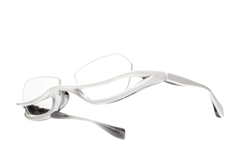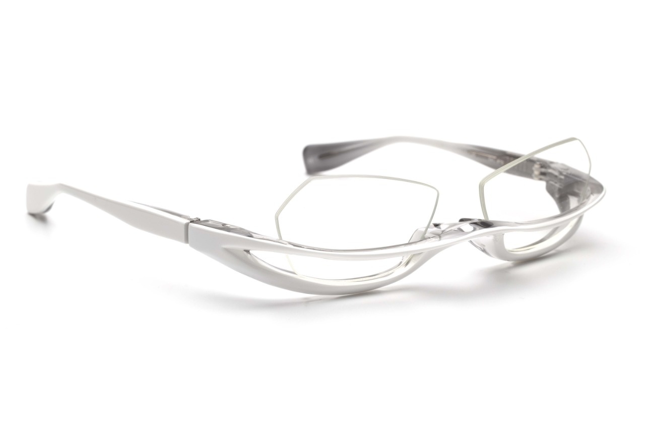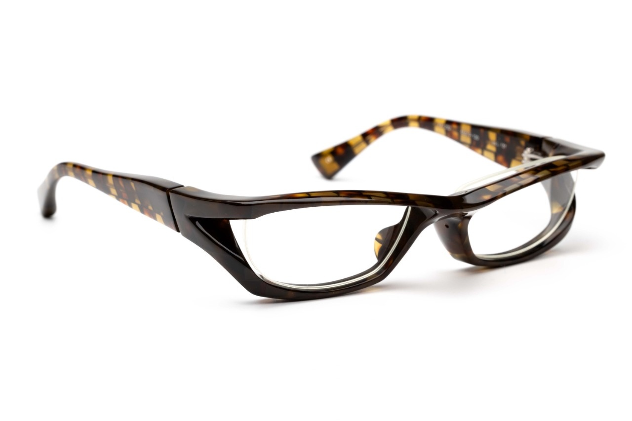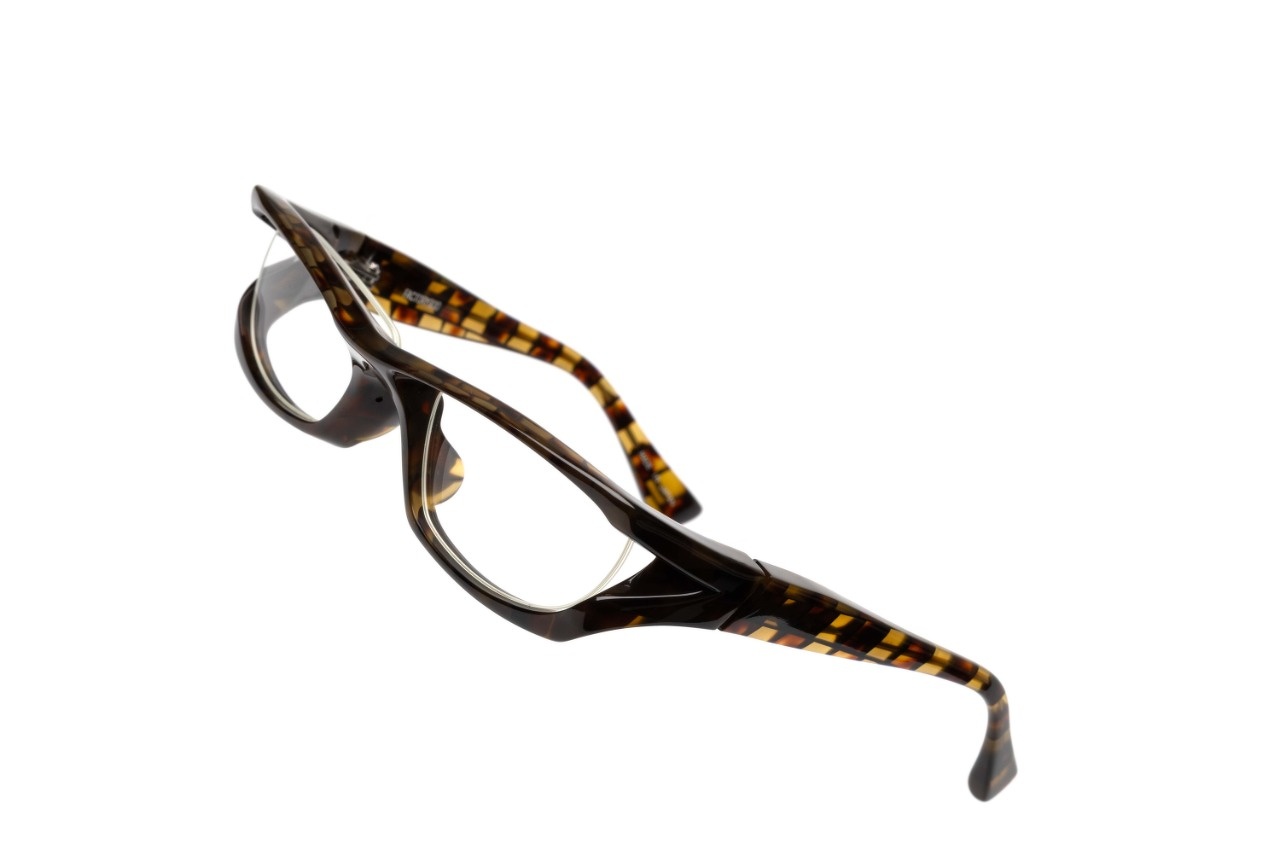 本来はあるはずもないレンズ前面に遮るように存在するアンダーブロー。見る時に邪魔にならないかといえば、決してそんな訳もなく想像通りの見え方になります(汗)様々な制約を排除し、視力矯正用具としてメガネに求められる見え方よりも”見られ方”を意識した田村氏渾身のデザインです。