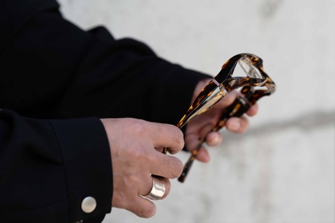 ご覧のように実際に掛けてしまうと意外にも柄の主張は控えめになり、赤青柄や黒白柄のようなインパクトはないものの、プロダクト本来の持ち味を殺さず、ソリッドなディテールを際立てます。なにより「FA-240」にシックな柄の組み合わせが非常に新鮮ですね。
