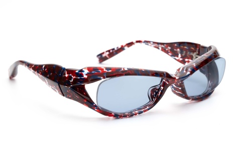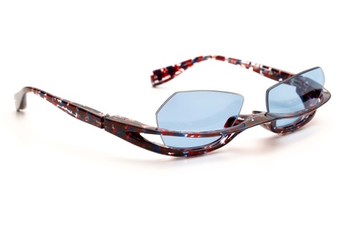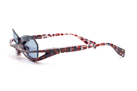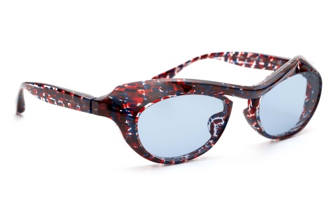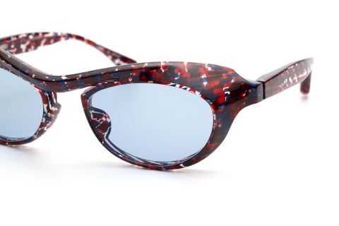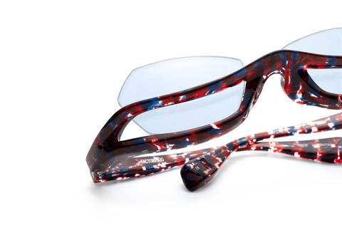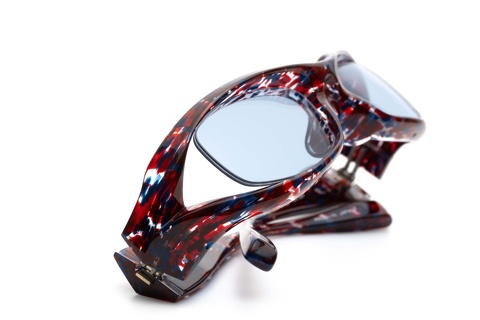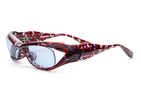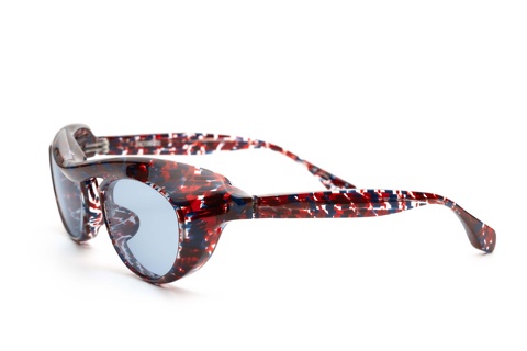 「col.159」(バラフ)とカラーレンズの組み合わせではクラシカルな雰囲気が感じられたものの、青赤柄とブルーのカラーレンズの組み合わせはサイバーなイメージを演出します。そう、どのカテゴリーにも属さないフューチャースティリックな佇まいは、この「col.239」(赤青柄)のよってさらに際立ちます。