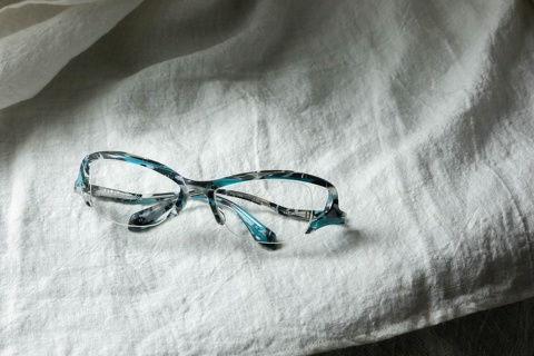 ブルーの柄が一際鮮やかで、なんとも不思議な色。眼鏡のフレームとして、表現されるにはとても珍しく、FACTORY900らしい生地です。アートメイクを施しているように目を惹くデザインとカラーが、お顔の中でメリハリを生み、若々しくなりますね。