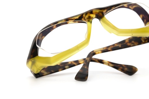 そう、上下に別れた色合いは、それぞれ別パーツを組み合わせることで完成する「FA-324」最大の特徴です。レトロシリーズでも多数のオリジナルのツートンカラーが存在しますが、完成に至るまでの工程は一般的なツートンカラーのそれとは全く異なります。多くの手間と時間を要することは「FA-324」に限ったことではありませんが、新たな製造行程と青山眼鏡の技術力がデザイナーの想いをカタチにしました。