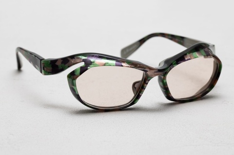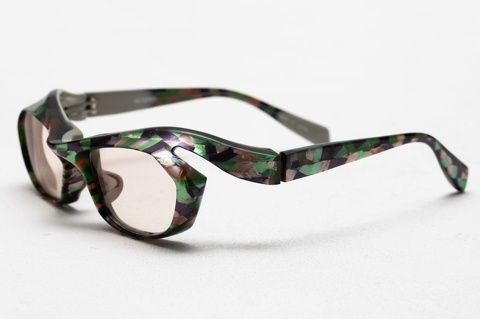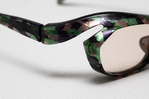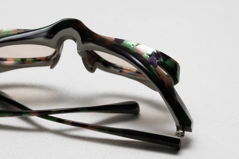 宝石を不規則に散りばめたかのような色とりどりの柄生地を前面に、背面は肌馴染みの良いグレーとの貼り合わせ、そのインパクトの強さを軽減させるため、カラーレンズを組み合わせることは非常に効果的です。