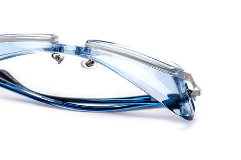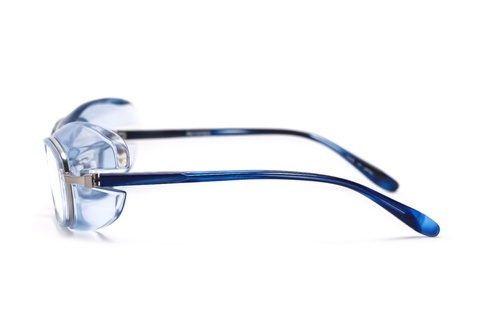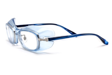 現在は、医療従事者の皆さんだけでなく一般販売もスタートし、公式オンラインショップでもお求めいただけるようになりました。当初は「col.840」(クリアグレー)とcol.825(クリアブルー) の2色展開となっていましたが、「col.840」は完売となり、今日ご紹介する「col.825」に関しては、少量ではありますが東京・大阪の両直営店ともに在庫の用意がございます。