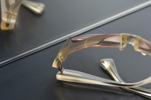 本来であればクラシックな印象のあるcol.880(キハク)、他のモデルではテンプルにバラフを合わせることで、よりその印象を強めてきましたが、FA-370ではテンプルにもキハクを使用した共色カラーを採用しております。
