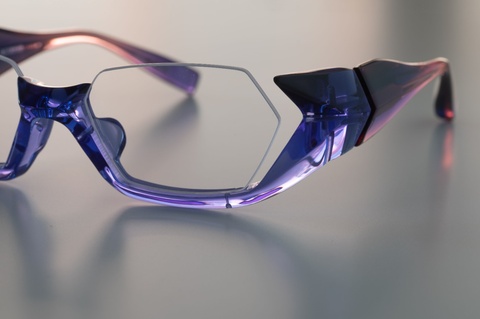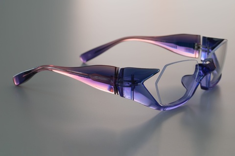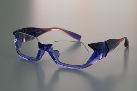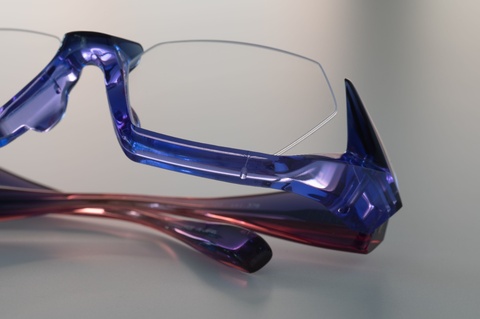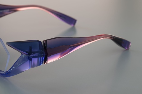 特徴的なレンズシェイプを収める、ブリッジ周辺からアンダーリムに見える青紫が、自然光によって際立ち鮮やかな色合いに。職人の手によって磨き上げられたアセテートが、より輝きを放ちます。