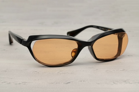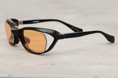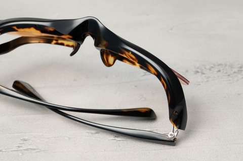 今回は、col.040(黒/デミ)ということで、背面に張り合わされたデミ柄とリンクさせるようなカラーレンズをチョイスしました。といっても、一般的なブラウンではなく、コントラストを高めるオレンジ系のカラーになります。表面の黒とのコントラストによってより立体的に、どこかサイバーなイメージを連想させる仕上がりです。