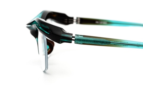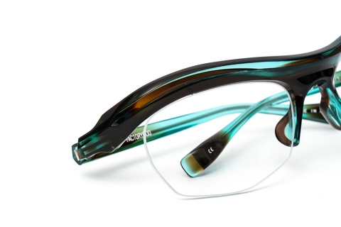 スリットの入ったブローラインからそのままテンプルに繋がっていくわけですが、ブローラインの茶からグリーンに変化していく様子がお分かりいただけるかと思います。つまり、この様子は実際に掛けた際にも反映され、サイドからご覧いただくとこの髪の毛から見え隠れするグリーンのラインがほどよいアクセントになります。