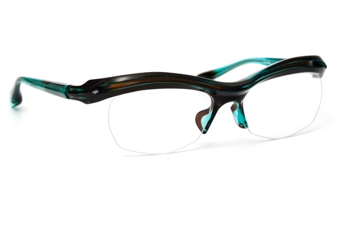 逆に正面からご覧いただくと、見た目の8割が”茶”・”グリーン”が2割といったところでしょうか。ハッキリとした色合いのため、ブローラインの印象は強調されがちですが、その分FACTORY900らしい躍動感が感じられます。もしご使用のシーンで可能であれば淡いカラーレンズを組み合わせることでレンズシェイプが際立ち、ブローラインとのバランスも取りやすくなるかと思います。