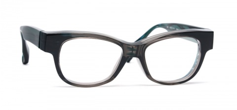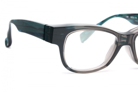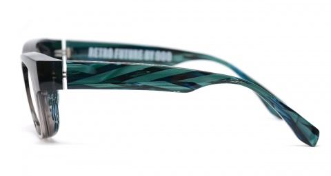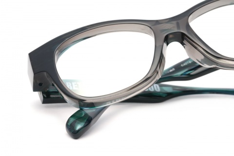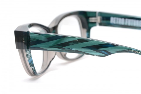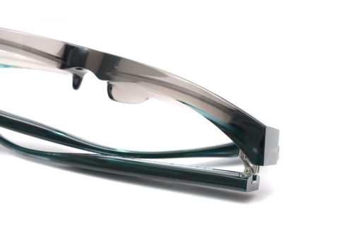 テンプルには、幾通りもの緑色のラインが折り重なったように見える柄生地を使用、フロントの裏面の一部にもその生地を張り合わせており、RF-008の特徴ともいえる最大厚13mmの造形を作り上げています。