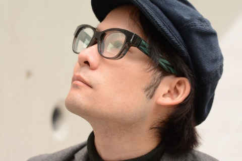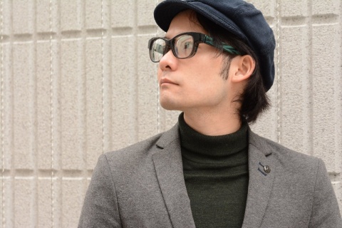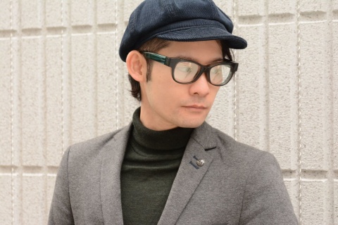 私にとって、RF-008はやや大きめです。自分の顔よりも大きいフレームをかける場合は、メガネの印象が勝ち過ぎないように気を使います。単色でも肌馴染みが良くスタイリングしやすいグレイを用いることで、RF-008の力強さを損なうことなく印象をやや薄めにします。