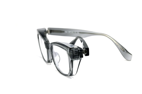 厚さの異なる2枚の生地を貼り合わせた14㎜の極厚生地を用い、フロント裏側を肉抜きすることでフード状のリムを実現。スタンダードなメガネよりも眼周辺を覆っている面積が多く、飛沫予防の効果が期待できます。
