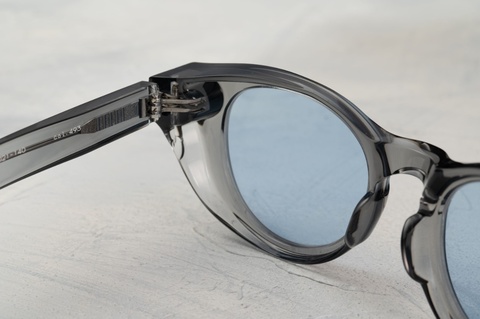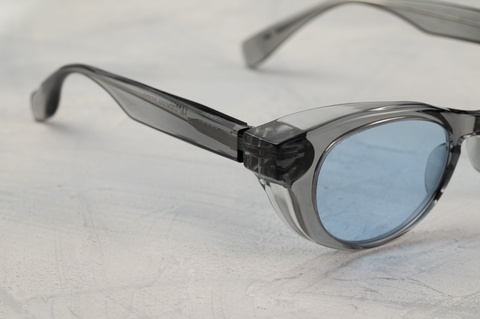 フレームカラーは見た目のボリュームを軽減できる「col.493」(ブルーグレー)、今の時代感を反映するクリア系のカラーに淡いブルーのカラーレンズを組み合わせてみました。レンズ濃度は44%、ここ最近は濃度28%の淡いグレーを組み合わせたサングラスをご提案していますが、今回はフレームカラーを活かす爽やかなレンズカラーになります。
