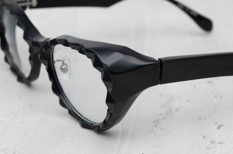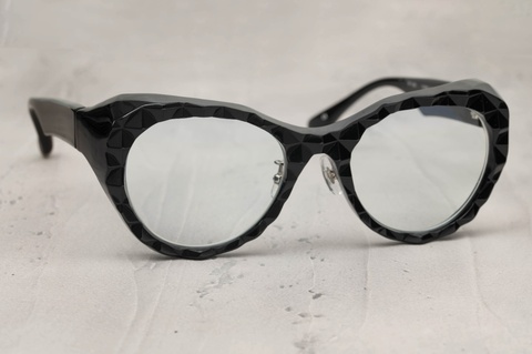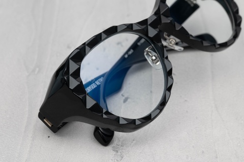 ”表面処理”を1つのテーマとした「RF-060番台」ご覧のようにフロントの表面にダイヤモンドパターンを施していますが、人気モデル「RF-064」とは異なり、均一の大きさで規則正しく配置しています。もともとサングラスということもあり、カラーレンズとフロントの一体感によりダイヤモンドパターンの印象が若干和らぎますが、クリアレンズになったことで、ダイヤモンドパターンがまるでスタッズのように際立ちます。
