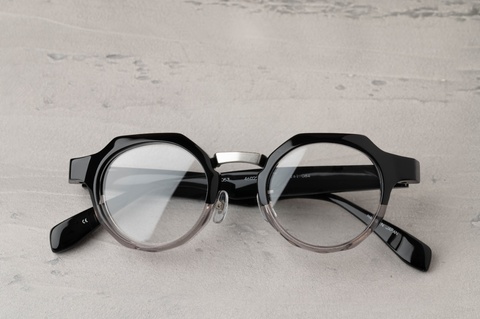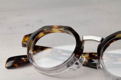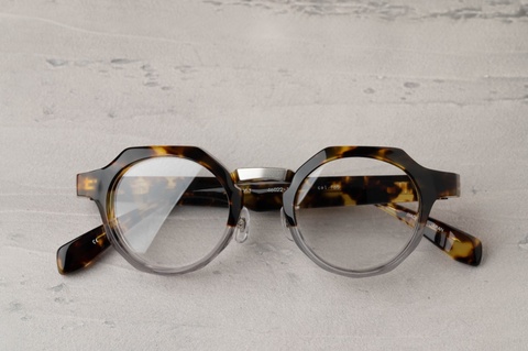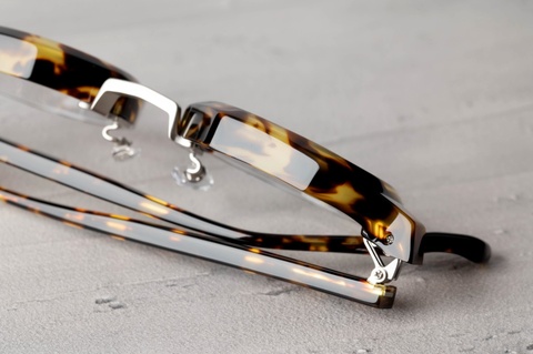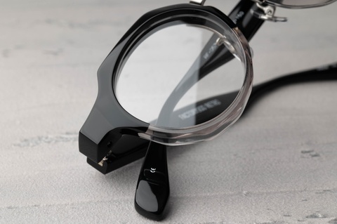 「RF-001」と同じようにFACTORY900らしい無骨なデザインではありますが、メタルパーツのブリッジを用いたコンビネーションフレームということもあり、実際に掛けてみるとフレーム単体のイメージよりもスッキリとした印象になります。存在感はあるものの、バラフとクリアカラーのコンビによって肌馴染みも良く、ここ最近では定番カラーの「col.001」(黒)よりも人気です。