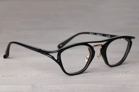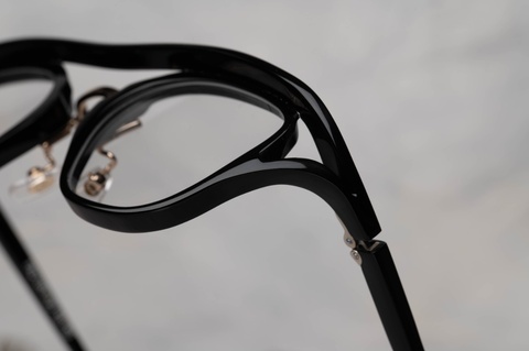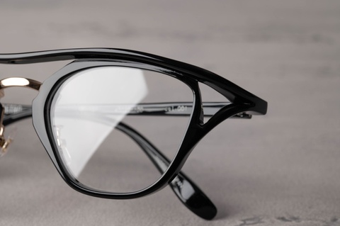 細身かつエッジーな造形によって、お顔に馴染みながらも適度なメリハリを与え、アセテートとは思えない立体感なフォルムが結果としてお顔にコントラストが加わりお顔の表情も豊かなものに。また、ブリッジにメタルパーツが加わることで知的な印象に磨きがかかります。