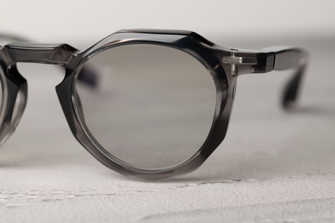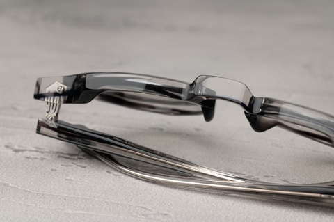 ご覧のようにフロントの上下でも厚みの強弱がつけられており、一見シンプルな作りに見えますが実はかなり手の込んだモデルといえます。これによりフレームに立体感が生まれ、お顔に合わせた際にも平面的な印象にならず、豊かな表情を印象付けます。