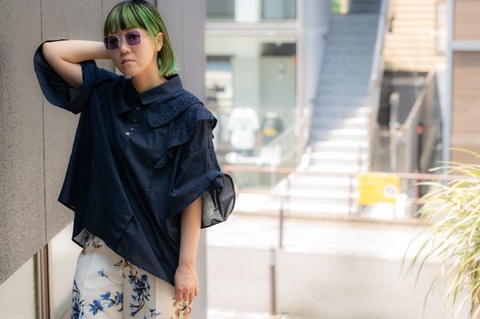 この2年で人気急上昇中のクリアカラーですが、今回はあえてサングラスとしてスタイリングを。カラーレンズを組み合わせたことで、フレームのシェイプがハッキリとお分かりいただけるかと思います。ビッグシェイプのスクエア型といえば、先日も「RF-014」をサングラスとしてご紹介しましたが、同シリーズならではの軽やかな見た目によって抜け感を演出します。