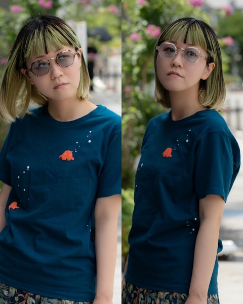 同じ「RF-057」ですが、ご覧のようにフレームカラーと組み合わせるカラーレンズによってその印象は全くのベツモノです。「col.049」よりもフレームの色合いがハッキリしている分、レンズの濃度が濃くなってもなんら違和感がなく、目の印象が見て取れる分、厳つい印象にもなりにくいかと思います。撮影時はマスクを外していますが、今日ご紹介した2つのサングラスは、マスクをした状態でも使いやすく、その点も人気のヒミツといえるかもしれません。