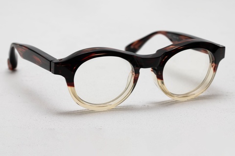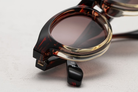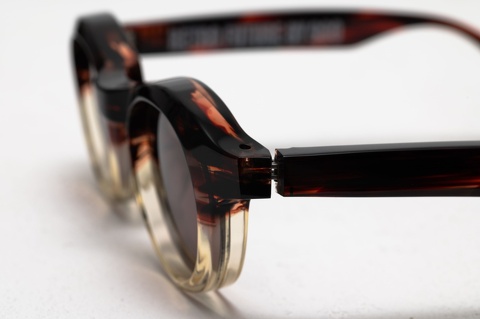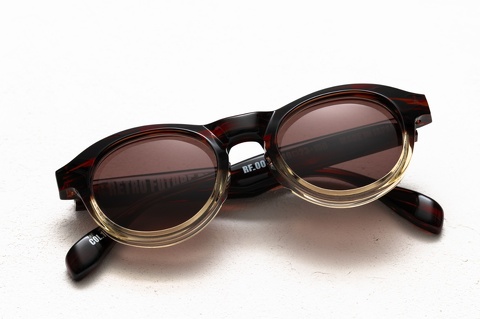 「RF-007」は、当初からクリアレンズを標準としたメガネとして発表しておりますが、個人的には、この独特なシェイプとサイズ感からサングラスとしてのご提案する機会が多く、特に今回ピックアップした「col.148」(ブラウンツートン)にカラーレンズの組み合わせは、今でもすこぶるカッコイイと思っています。