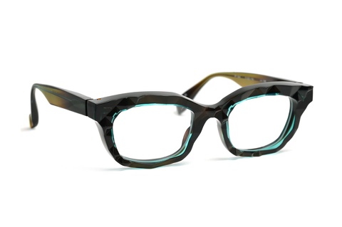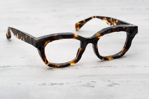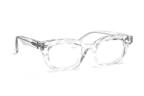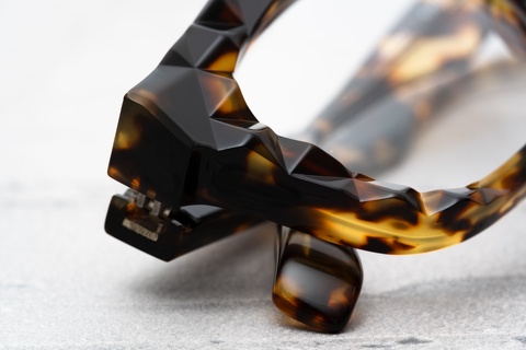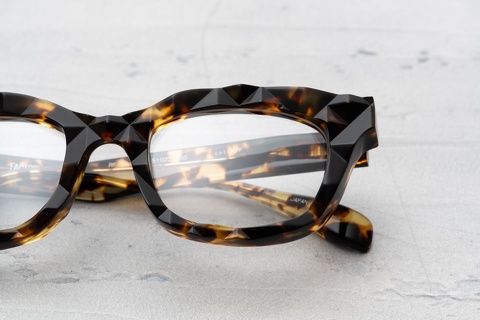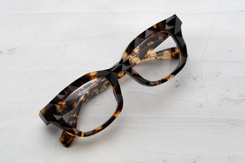「RF-064」最大の特徴であるダイヤモンドパターン。アセテートの色合いによっても印象が大きく変わりますが、ソリッドな色合いの方が光の反射によるキラキラとした輝きが増し「RF-064」の特徴が大いに発揮されます。