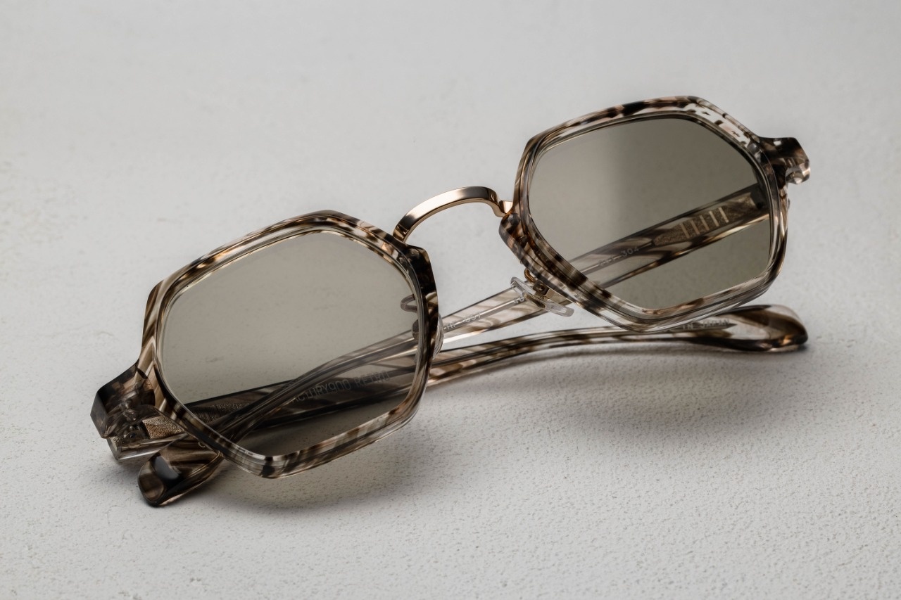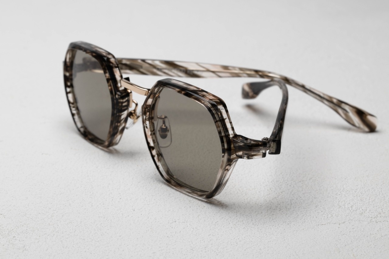 FACTORY900 RETROのコレクション以外にもヘキサゴン型(六角形)のモデルは多数存在しますが、やはり比較的オーソドックなシェイプに比べクセのあることは間違いありませんが、この「RF-057」に関してはフロントに施した面カットに丸みをもたせることで、そのシェイプが際立ってしまうことを抑え、顔馴染みの良さを作り出しました。