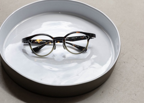 トップリムに387のデミを使い、下部分がオリーブ系のグリーンになっているツートンRF-180。正面から見るとシンプルな丸みのあるデザインに見えますが、少し複雑な立体的フレームになっています。実際にかけてみていただくとわかる、デザインの趣は、真面目な中に愛嬌をプラスしたような味わい深いフレーム。デミとグリーンのツートンが、クラシカルなものと、それに反するドラマティックなイメージとを行き来きするような、不思議なカラーとなっています。