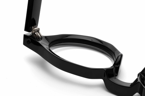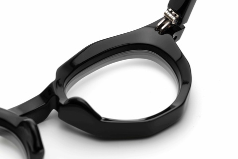 そこで改めて「RF-071」のサイズに着目してみると、サイズ47mm鼻幅23mmと、意外にも一般的なクラウンパント型に比べ大きく、さらに「RF-001」をはじめとした1stモデルで採用していた極厚のテンプルを若干スリムにすることで、掛け心地の安定化を図りました。また、それと同時にフロントの裏側をすり鉢状に削り取り全体的な軽量化を実現しました。