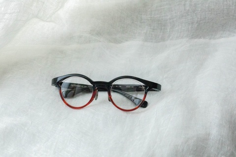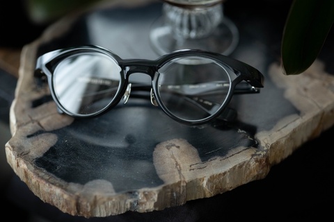 特徴的な奥行きのあるブローライン。モデルとなったのはマルマンオプティカル「Titanos」とのコラボレーションモデル「MF-001」です。デザインとしてベースにはなっておりますが、比べてみるとやはり違いは歴然です。アセテート素材のモノ、チタン製のモノ、同じ眼鏡であってもアプローチが違えば印象は全く変わるものだとあらためて感じさせてくれたモデルです。