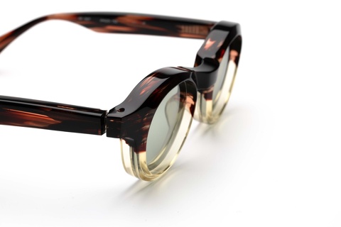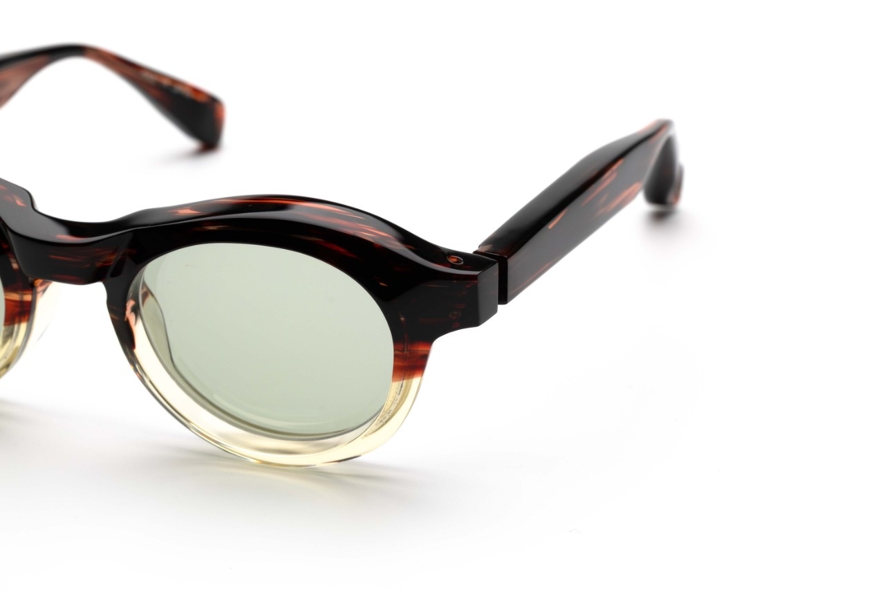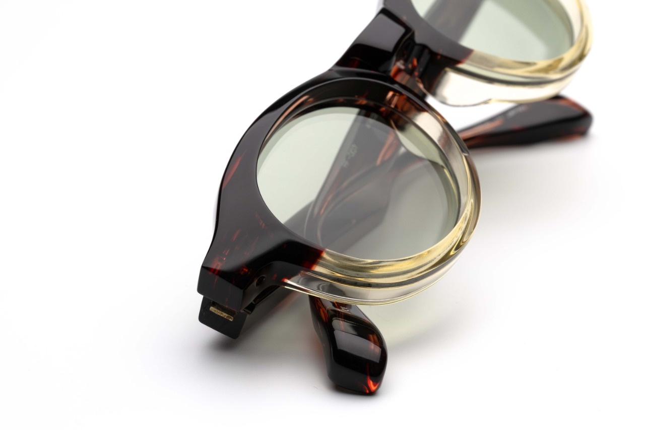 「より近未来的な新しいヴィンテージの提案」というテーマに基づき、当時の空気感や造形技術を意識しながらも特徴的なブローラインからなるレンズシェイプは、どこか新しさを感じさせてくれます。このサイズ感も含め、個人的には当時からオプティカルよりもサングラスとしてご提案することが多く、TOKYO BASEでは在庫の半数をサングラス仕様としてご用意しております。