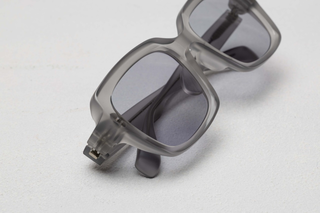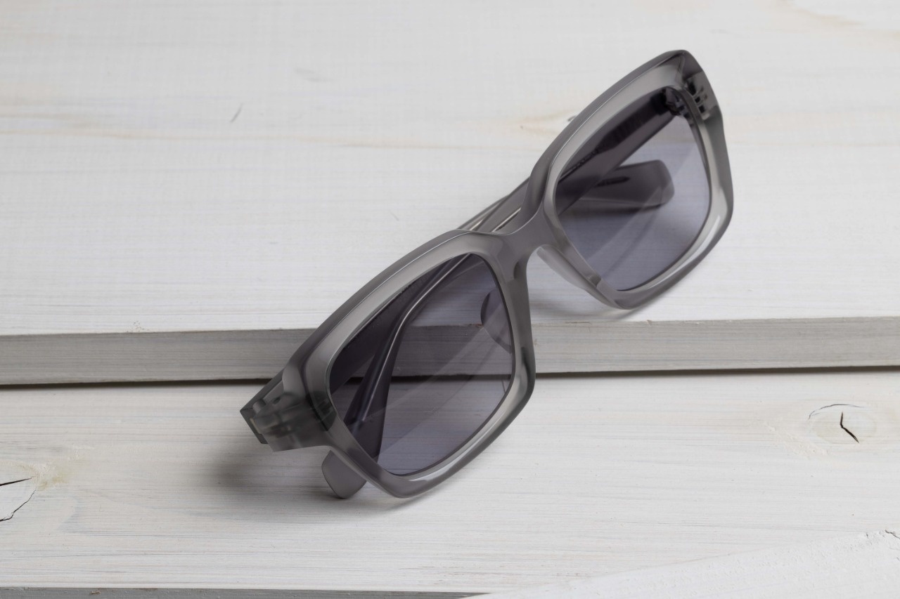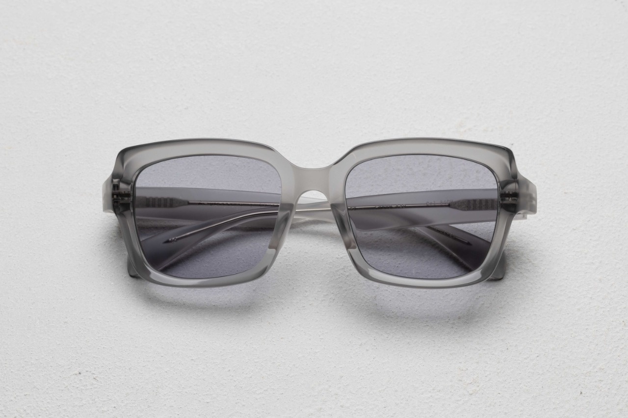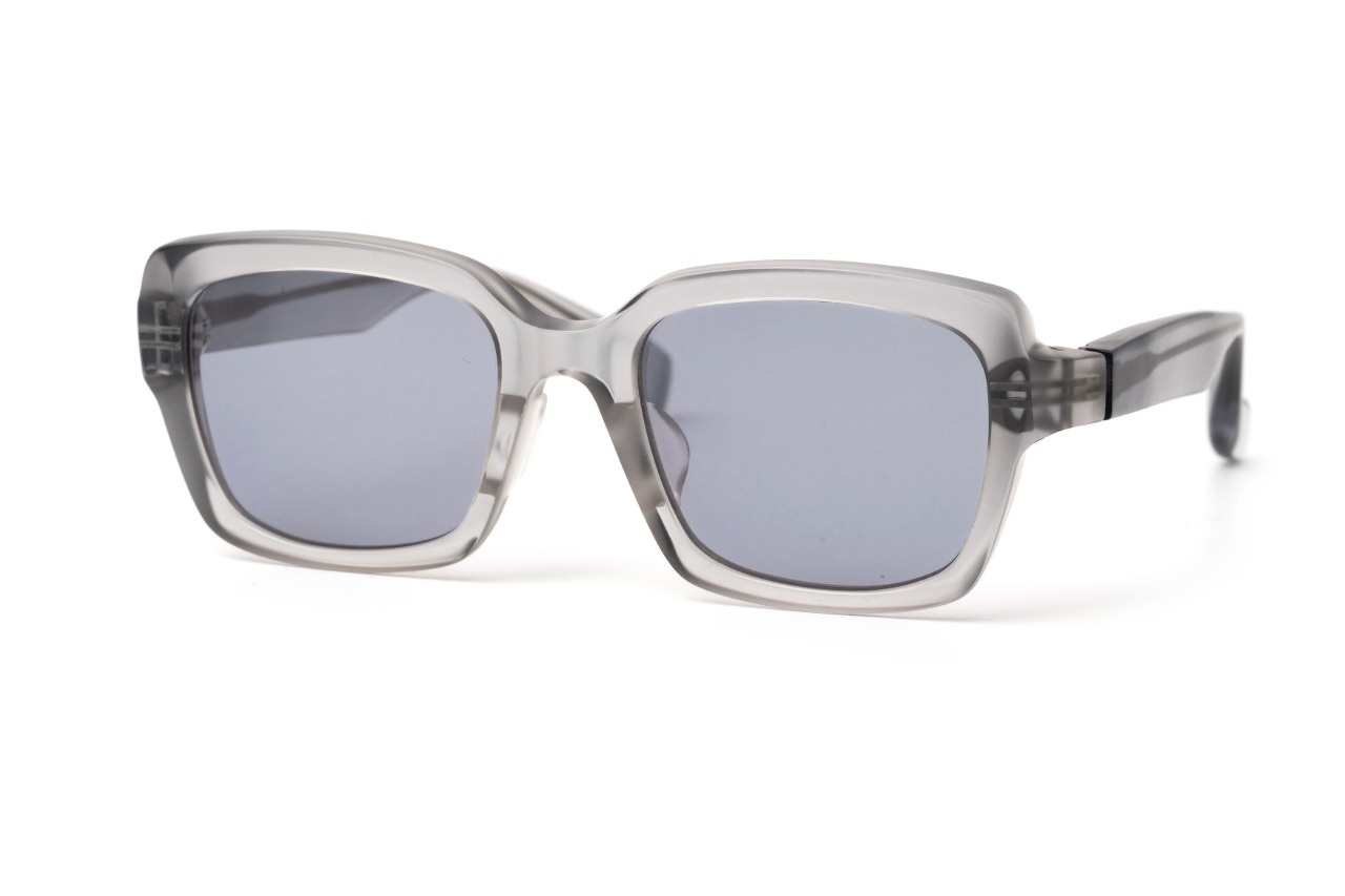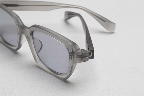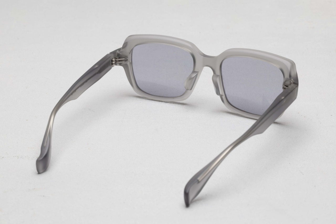 注目すべきは平面的なフロント面にテレビジョンカットを施し、シンプルな造形でありながら奥行きのある立体的なデザインを生み出しました。また、そのディテールからもお分かりのように本来はエッジの効いたラインが際立つかと思いきや、マット加工を施したことによる独特の手触りだけでなく見た目も柔らかくなり、サングラスでありながら顔馴染みがぐっと良くなります。