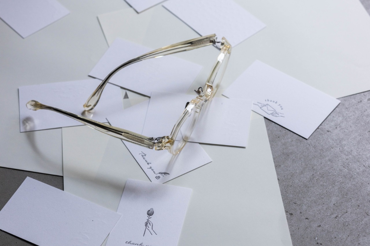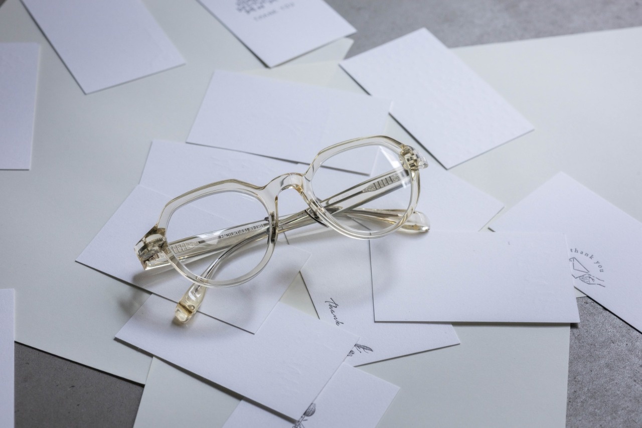 淡いキハクカラー。春夏になると気になる方が急増しますが、もちろん冬でも素敵です。レンズカラーを薄く入れていただいても、逆に濃いめを入れていただくとクリアなカラーが際立ちかっこいいです。ピンクなどの楽しいカラーを入れると一気にアバンギャルドファッション要素の強いデザインに昇華します。