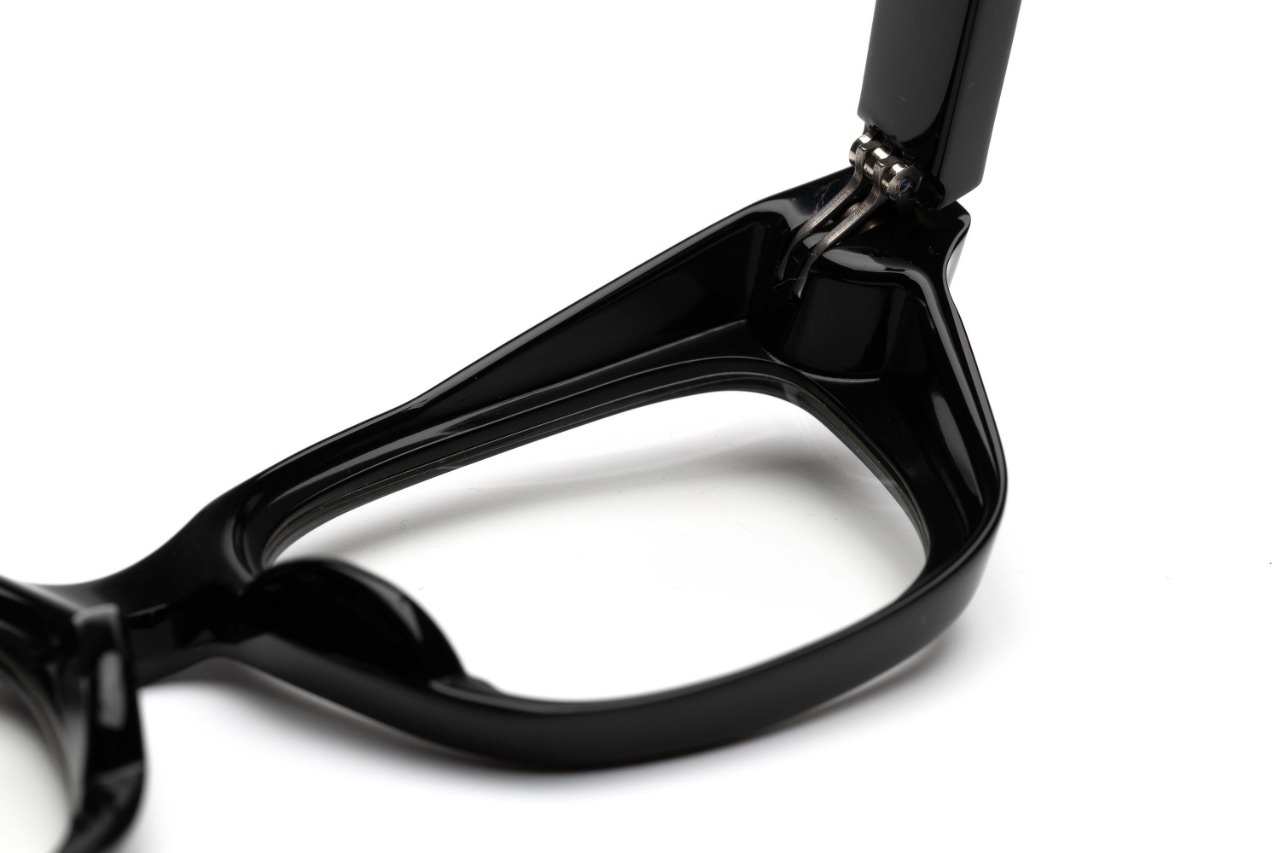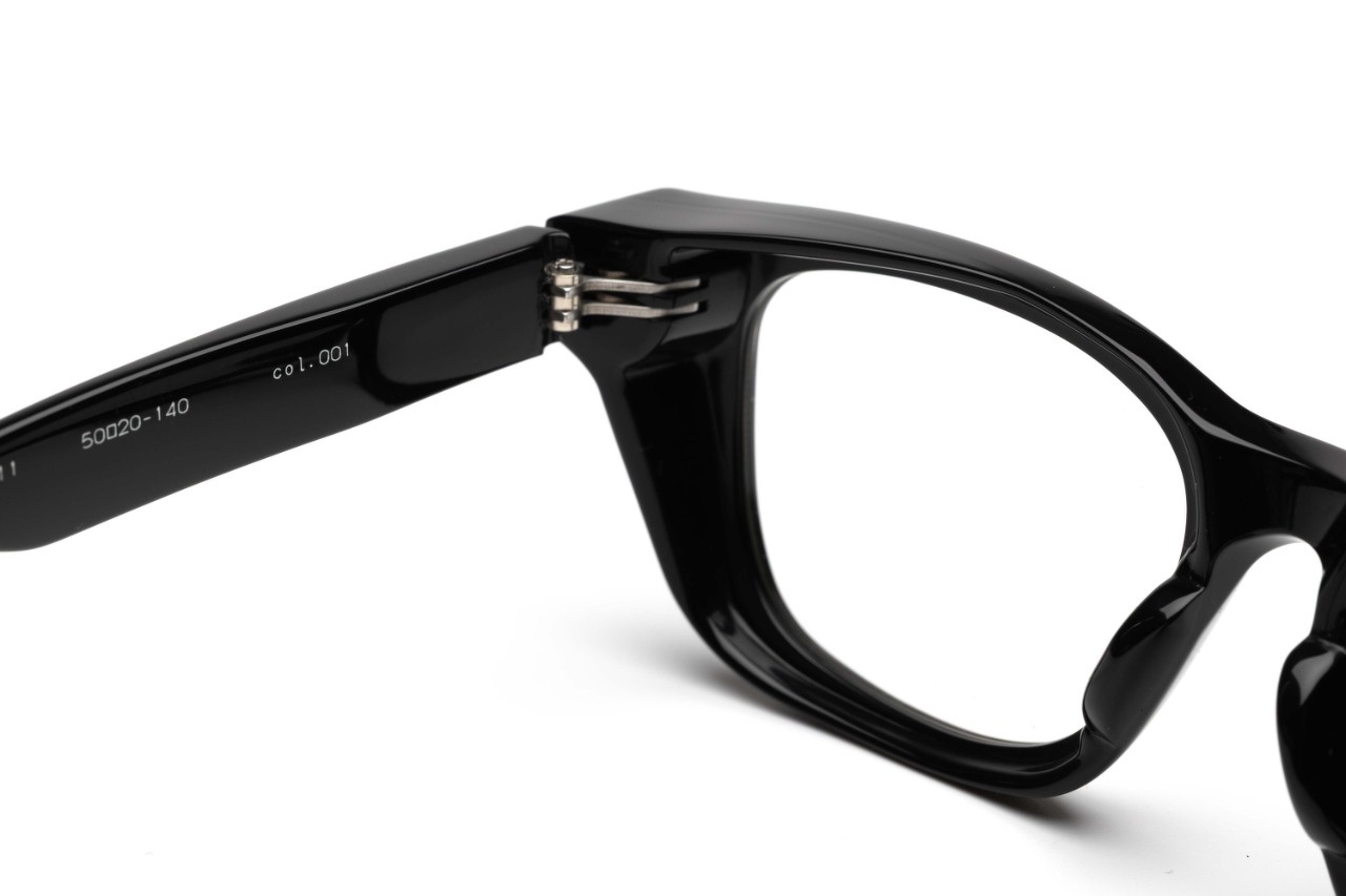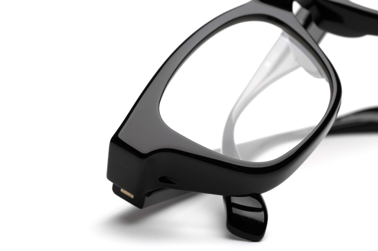 一見なんら変哲もないシンプルなウェリントン型に見えますが、このように角度を変えると肉厚で奥行きのあるリムが現れます。肉厚で重厚感のあるデザインはFACTORY900の代名詞のようでもありますが、実は単純に厚みをもたせた訳ではなく、極厚のフロント裏側を大胆に肉抜きすることで軽量化を図るとともに、フードのようなフロントリムが上部やサイドからの埃や花粉の侵入を軽減させます。