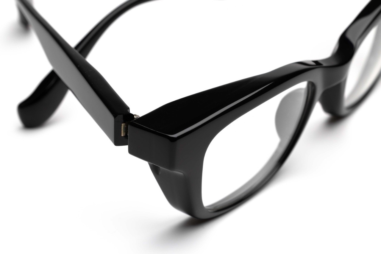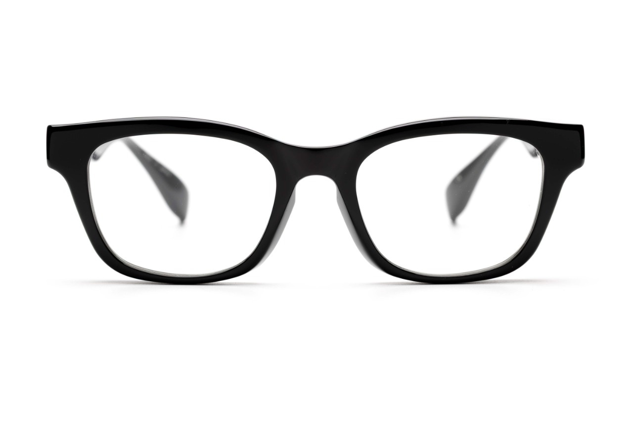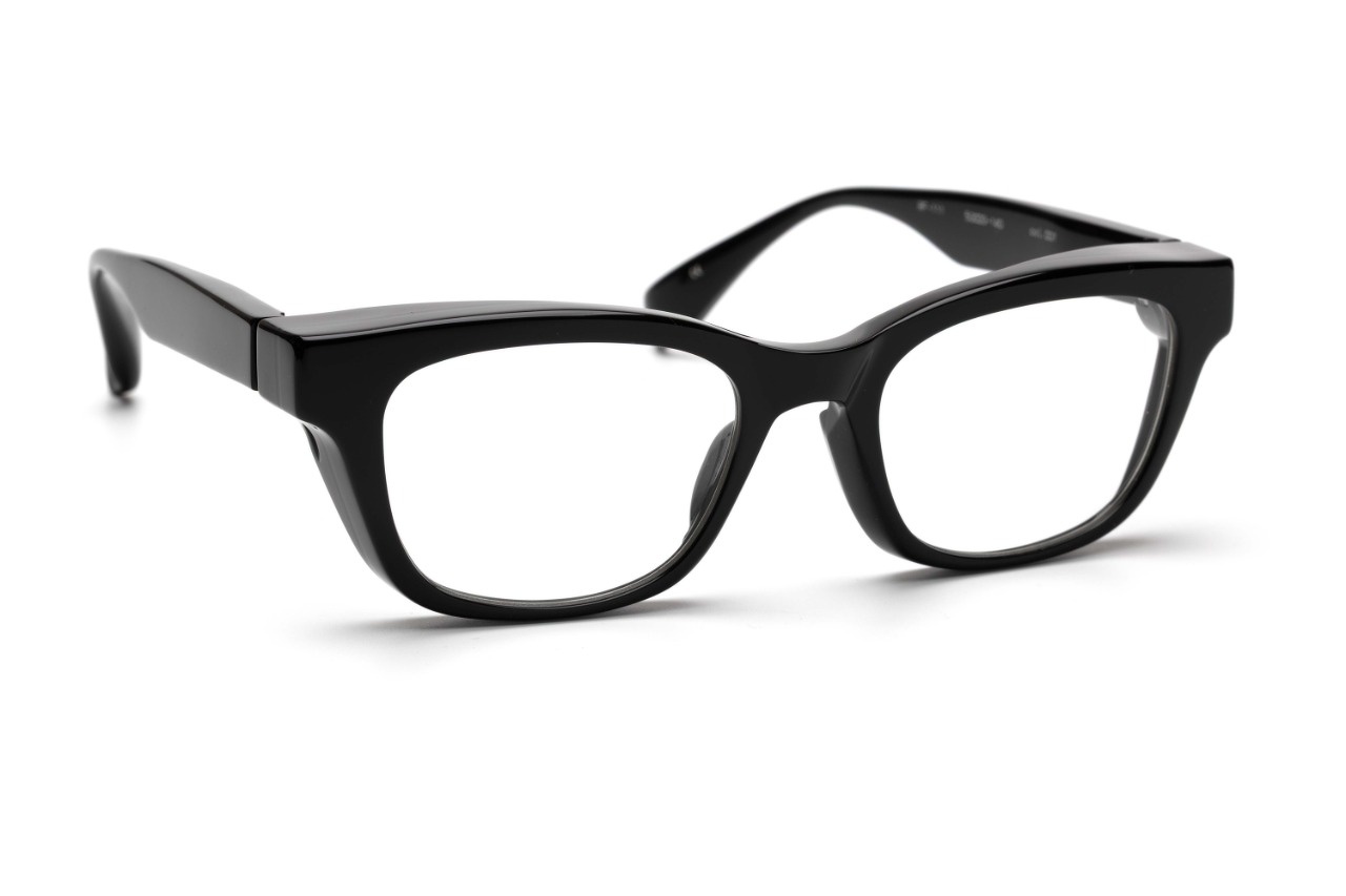 一見なんら変哲もないシンプルなウェリントン型に見えますが、このように角度を変えると肉厚で奥行きのあるリムが現れます。肉厚で重厚感のあるデザインはFACTORY900の代名詞のようでもありますが、実は単純に厚みをもたせた訳ではなく、極厚のフロント裏側を大胆に肉抜きすることで軽量化を図るとともに、フードのようなフロントリムが上部やサイドからの埃や花粉の侵入を軽減させます。