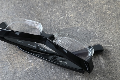テレビジョンカットならではのエッジーなフォルムは、本来はクラシカルな印象を与えるウェリントン型にその随所から未来感が漂います。そう、今回久しぶりの入荷となった「col.075」といえば、レトロシリーズでも多用している黒ツートンであり、クラシックスタイルでは王道と呼べるカラーになりますが、factory900が提案する未来のウエリントン型は、一見クラシカルな色使いだったとしてもフューチャーを感じ取っていただけるハズです。