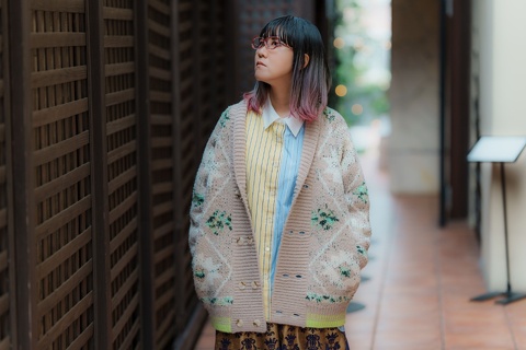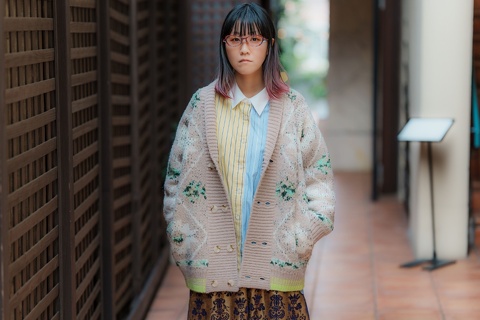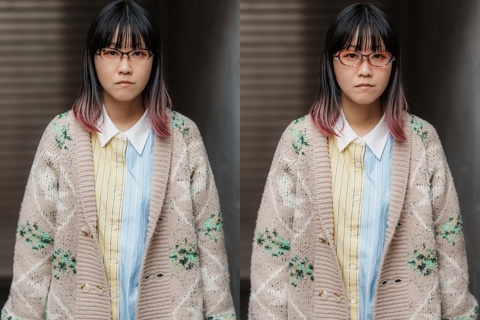 比較しようとすると、どうしても特徴的な「col.362」(赤柄)の色合いに引っ張られてしまいますが、サイズ感に関しては「fa-2011」の方がやや大きく、それ以上にクセの少ないデザインであることがお分かりいただけるかと思います。余談ですが、松本いわく、この日は2つの異なるデザインのスタイルサンプルを撮影するため、目元のメイクを普段よりもややハッキリとさせとのことです。