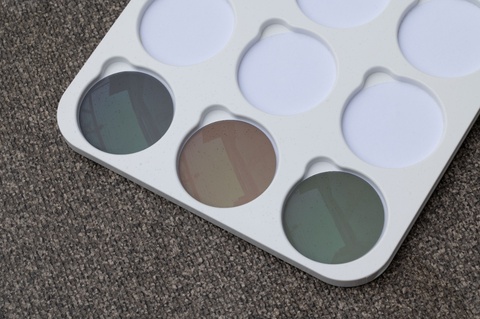 小雨の降りしきる14時の屋外ですが、早速トレーに載せたサンプルが発色しています。ここまで約30秒、小雨とはいえ比較的しっかり発色した印象です。念のため、以前の紫外線調光”サンテックシリーズ”も一緒に屋外に出してみましたが、同じく発色が見られます。