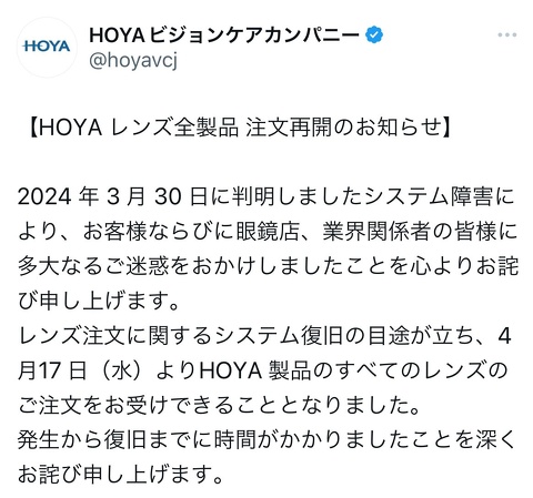 すでにブログでもご案内したように、3月30日未明に発生したレンズメーカーHOYAの大規模なシステム障害により、レンズの受注・出荷状況の確認など、業務に関わるすべてのシステムが停止し、納期遅れなどお客様には大変ご迷惑をお掛けしておりましたが、昨日からレンズ注文に関するシステムが復旧しHOYA製品すべてのレンズの注文ができるようになりました。しかし、当面の間はレンズの到着まで通常よりも3日前後遅れるとのことです。すでにご注文をいただいていたお客様のレンズも一部はキャンセル扱いとなり、改めてオーダーをさせていただくことになり、出来上がりまでもう少々お時間をいただきます。ご迷惑をお掛けいたしますが、レンズの到着まで今しばらくお待ちください。