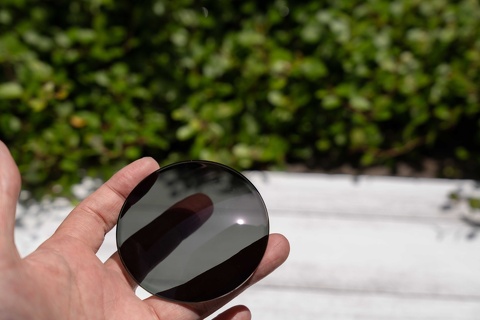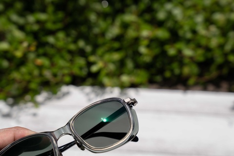下の写真のように通常調光レンズはレンズの反射色が通常グリーンになりますが、”Sun Pro”は目元を美しく魅せるホワイト系の反射色です。