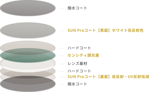 ご覧のように”SUN Pro”コート最大の特徴は、レンズ表面のホワイト系の反射色に加え、背面に施した低反射によってレンズ裏面から目に反射して入ってくるUVも約95%カットします。いわゆる以前からカラーレンズをお選びのお客様に積極的にご提案している”ヴィーナスガードコートパールRUV”と同じ効果がSENSITY2・SENSITY DARKでも得られるようになりました。