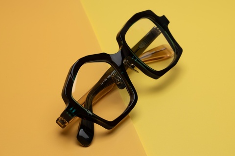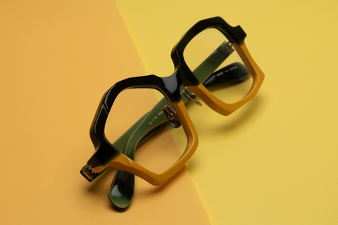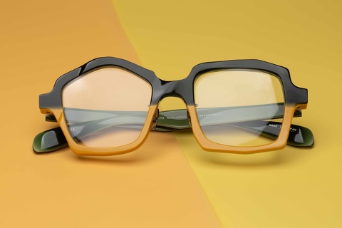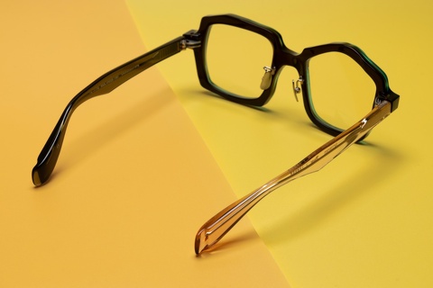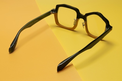 とはいえ、ただ単純に四角と多角を組み合わせたアシンメトリーではなく、フロントそのものに緩やかにうねりをつけ、光の当たり方によってコントラストが生まれるようデザインされています。また、オリジナルのツートンカラーは黒とイエローにように見えますが、実際は濃いカーキとイエロー、加えてテンプルの色合いにも拘りが見られます。しかし、これがなかなか写真では表現できず・・・是非手に取ってご覧いただきたいところです。