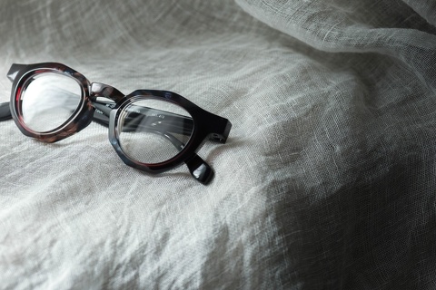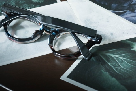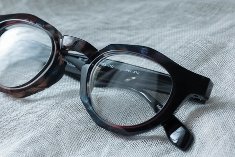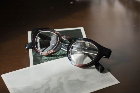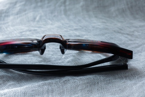 光に当てると、一体何色あるのだろうというぐらい、マルチなカラーで魅せてくれます。その不思議な色ゆえに、ちょっとハードルが高めに見えてしまうこともありますが、これもどう似合わせるかで変わってきますね!先日、この限定カラーの色違いをご購入いただいた女性の方は、シルバーヘアで、真っ黒のフレアなワンピースというスタイリングで、伊達メガネとして、とっても素敵にかけこなしていただきました。