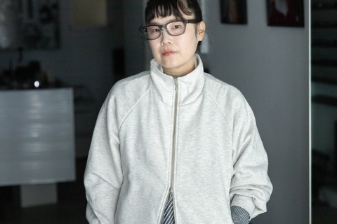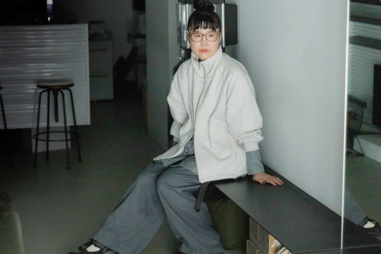 秋冬の淡いトーンのお洋服。色が淡くとも重ね着することでスタイリングに厚みが出ます。この透け感のある分厚さのあるフレームがちょうど良いバランスになっていることが、動画でよくわかるかなと思います。