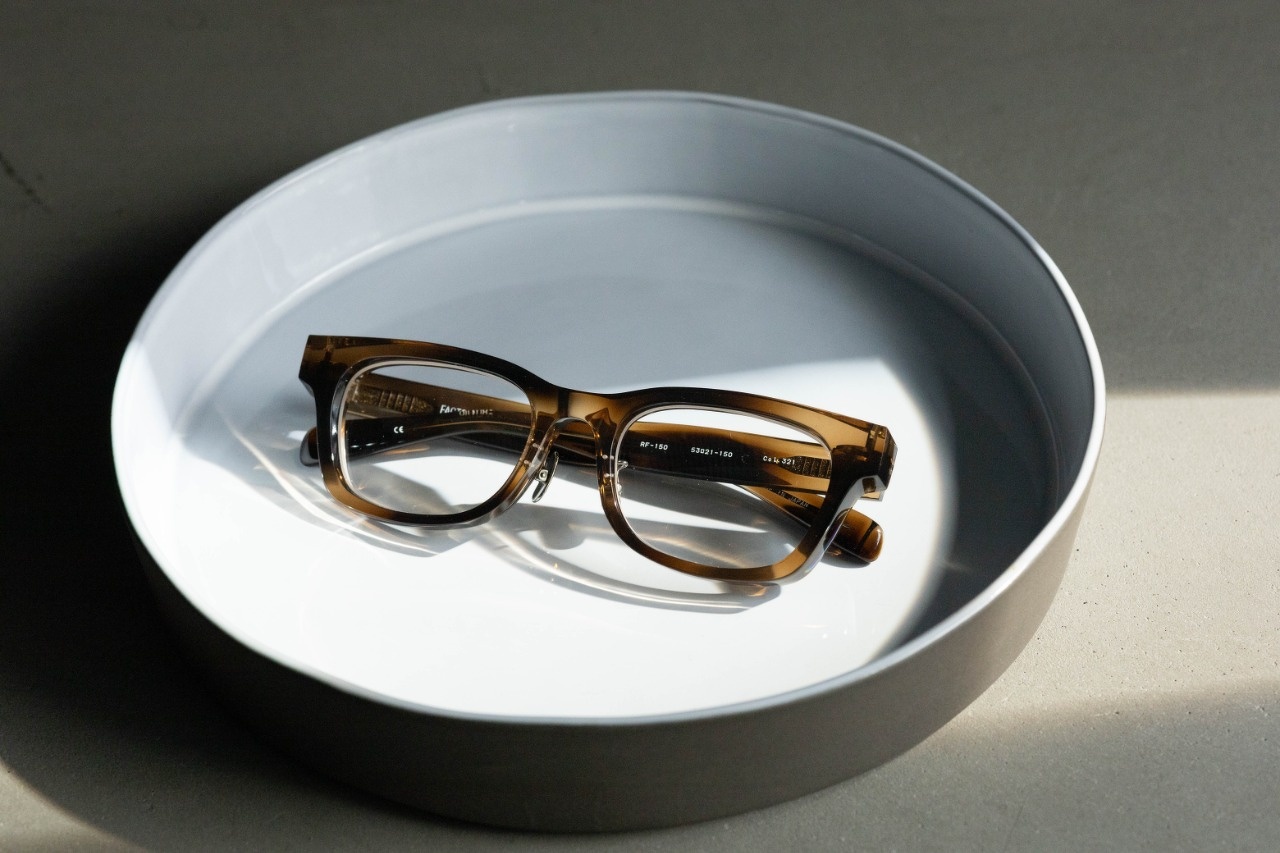 無骨なフロントが印象的な、大ぶりのウェリントン型の「RF-150」。シンプルながらもFACTORY900らしい、思い切った面造形。厚みのあるところは10㎜もある太めでクールな印象。ビジネスシーンで人気の高いモデルです。
